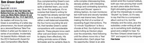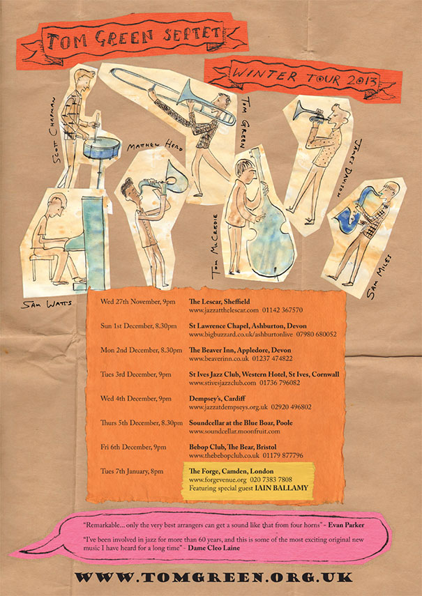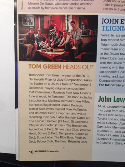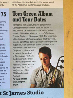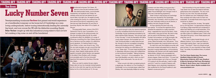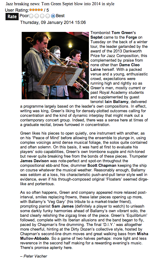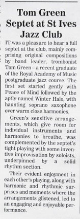 London Jazz News Interview with John Fordham: "Tom Green has stood out for the coupling of an original imagination to consummate craftsmanship – yet he does the most difficult things without ostentation, since he and his musicians consistently sound as if they’re just trying to have the most fun they can."