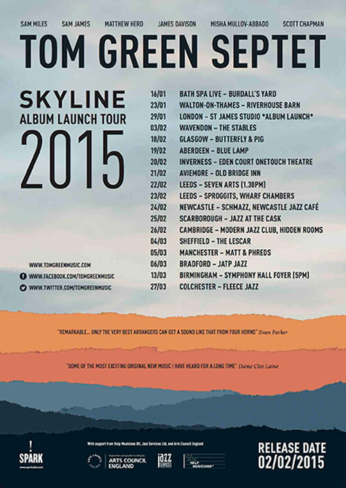 Their debut album “Skyline” was released in February 2015 to unanimous critical acclaim, with the band undertaking an 18-date launch tour from Inverness in Scotland to St Ives in Cornwall. Dave Gelly in the Observer (4*) described it as “a kaleidoscope of harmony that is not only phenomenally skilful, but absorbing and endlessly entertaining, too.” The CD was recorded at Real World Studios and released on Tom’s own Spark label. It was described in Jazzwise as “startlingly good and a delight to hear” (4*), and according to Peter Bacon of the Jazz Breakfast blog, “there’s little point in picking out highlights – the whole album is a highlight.”